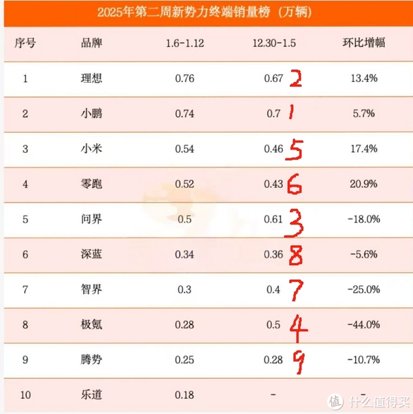 空口无凭,以数据为证,上图是机构统计的2025年第一、二周新势力的销量榜单。